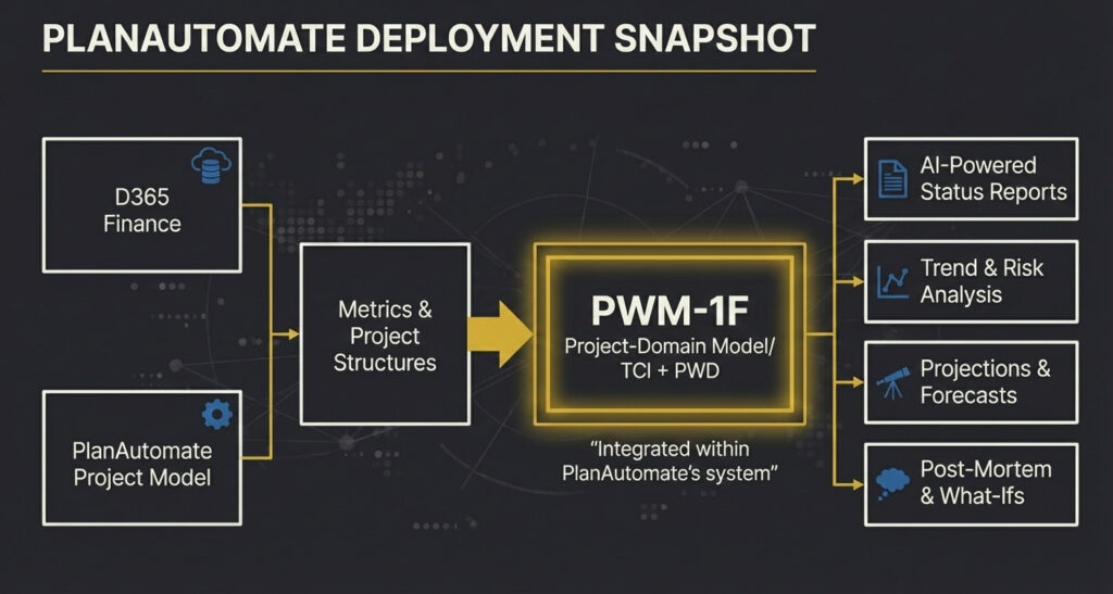 After projects close, PlanAutomate can use the same capabilities for post-mortems and counterfactuals. Instead of only recording what went wrong, teams can ask what combination of factors led there and explore how different decisions might have changed the outcome. To their customers this appears as an experienced project advisor embedded in the system they already use. Under the surface, it is PWM-1F doing the metric-trajectory reading, causal reasoning and explanation that powers those experiences.